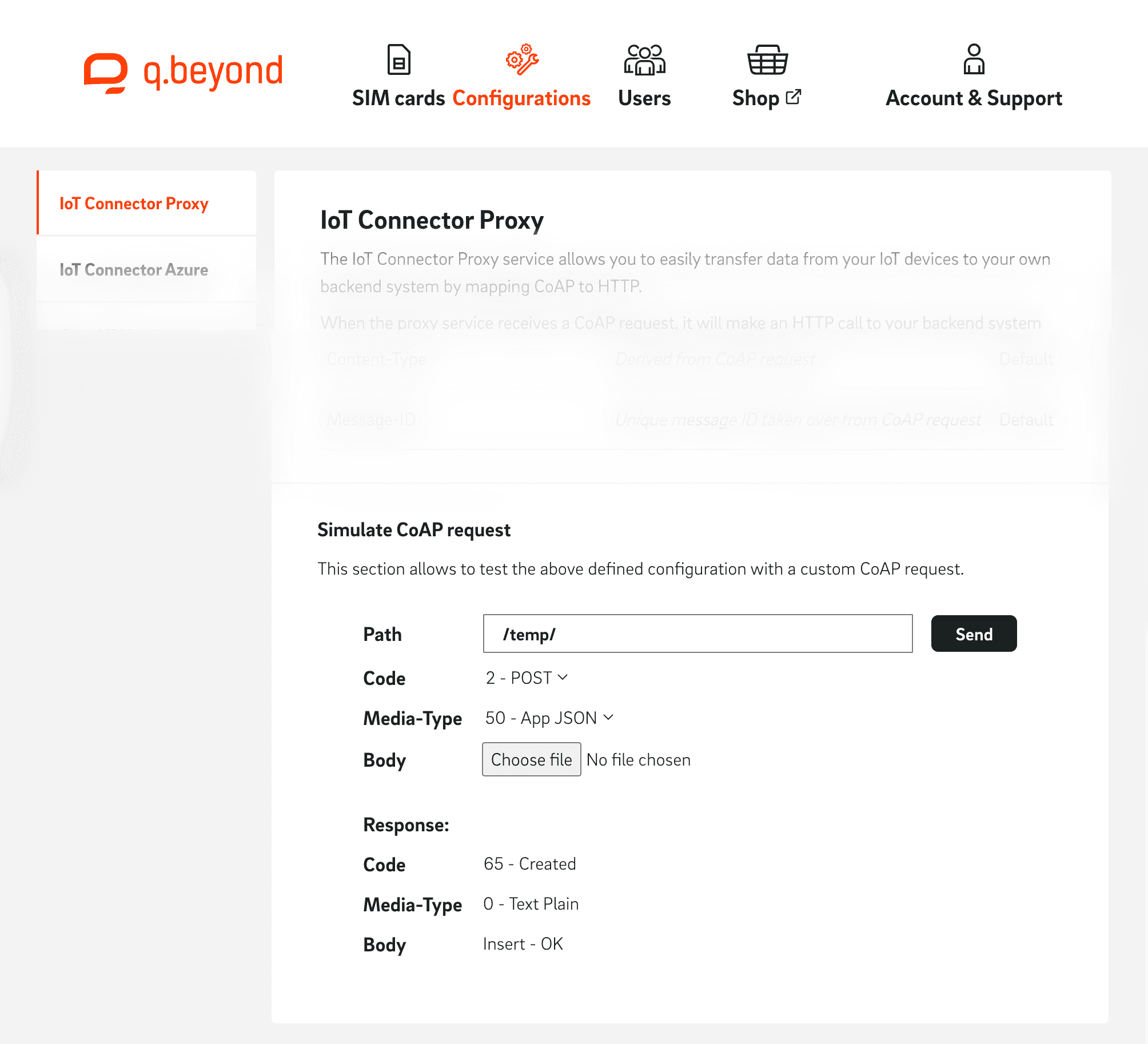 The IoT device can now send messages to the proxy using CoAP, which are then passed on to the Lambda function with the appropriate URL and the Authorization header. The URL of the proxy is coap://proxy.connect-internal.iot-sim.tech:5683 (only accessible from the network of IoT SIM).