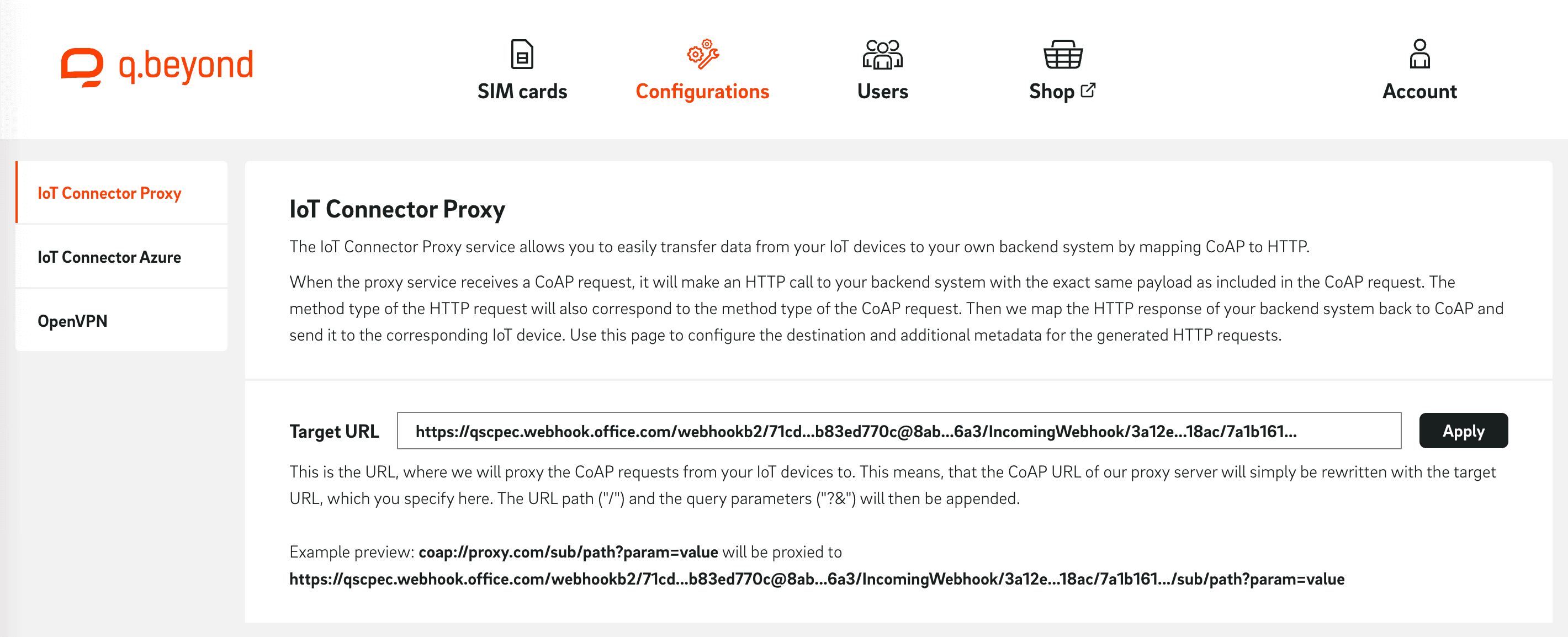 In this step, we store the previously generated webhook URL in the proxy configuration. To do this, open the IoT SIM portal, navigate to the "Configurations" tab, and select "IoT Connector Proxy" there. Paste the previously generated webhook URL into the text field next to "Target URL" and confirm the entry with "Apply".